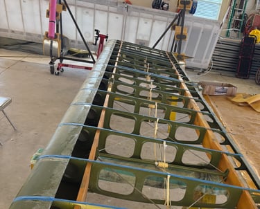 The flight controls are inspected/repaired, and the airframe is then covered, primed, and painted using the Airtech Fabric Coating Process.